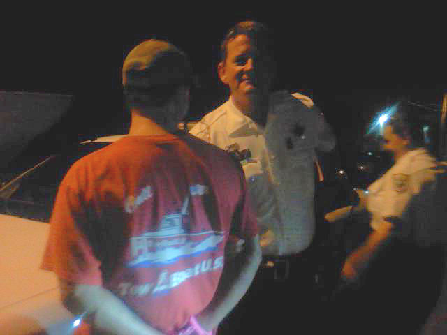 It reassured Travis to know that at the age of 35 he's still limber enough to be handcuffed from behind. Heck, for a brief second, he even considered the fact that he might be able to make a break for it and outrun them -if it weren't for the flip flops he was wearing. Outrun the cops -really, honey?