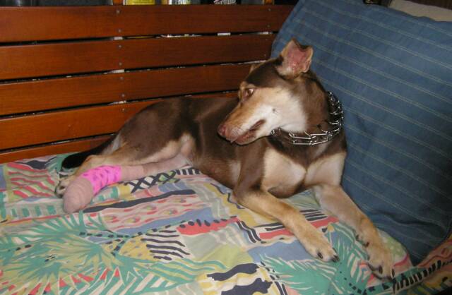 Did I mention our little lady is quite the tomboy? Just like her mom, I suppose. She tears it up so hard on the grass with the other dogs it's a wonder she doesn't get more injuries than she does. My Mom always figured us kids had guardian angels to keep us in one piece. Well, Sadie ran faster than her guardian angel could fly this time. We figure she caught her foot in a crab hole and she did it up nicely, indeed. X-rays showed that she had a triangular piece of bone that wasn't even attached to anything, plus a hairline fracture running up her foot. It didn't slow her down much, though. After only a few days with the cast she was getting around without even so much as a limp -she sounded like a peg leg pirate walking down the dock.